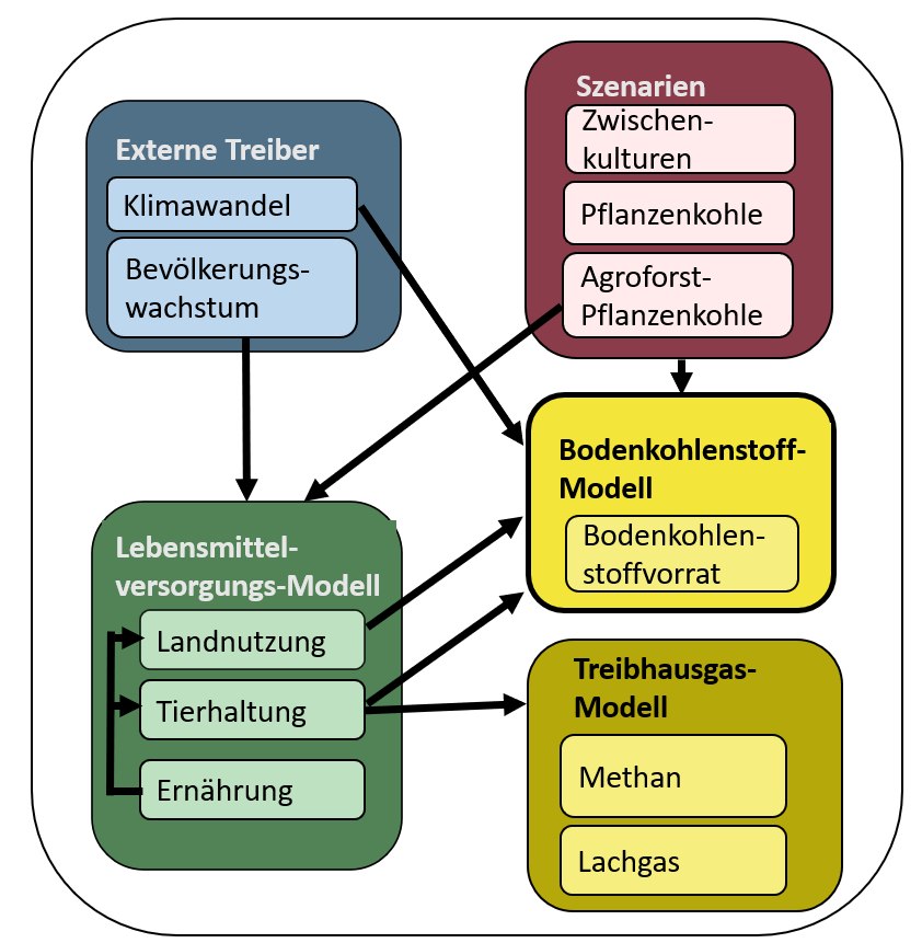 • Es ist entscheidend, sowohl die aktuellen (z.B. landwirtschaftliche Praktiken) als auch zukünftige Bedingungen wie das Bevölkerungswachstum oder den Klimawandel für die Quantifizierung realistischer Bodenkohlenstoff- Sequestrierungspotentiale im Modell zu integrieren.