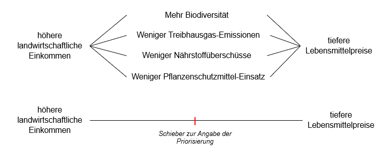 Um diese Frage zu beantworten, haben Agroscope und die ETH Zürich die agrarpolitischen Präferenzen von 1542 Befragten in drei Schweizer Sprachregionen (deutsch, französisch, italienisch) analysiert, die folgend ihrer eigenen Aussage in sehr ländlichen bis sehr städtischen Gebieten leben. Von besonderem Interesse war die Priorisierung eines Ziels durch die Befragten, wenn dieses in direktem Zielkonflikt zu einem zweiten Ziel bewertet werden sollte. Die Umfrage-Teilnehmenden wurden zu neun verschiedenen Zielpaaren befragt (siehe Graphik).