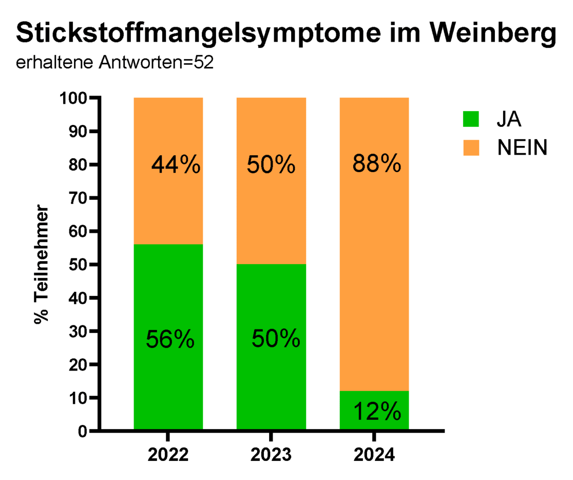 Abbildung 1: Prozentualer Anteil der Befragten, die Stickstoffmangelsymptome im Weinberg beobachteten, nach Jahrgängen: 2022 (56 % ja und 44 % nein); 2023 (50 % ja und 50 % nein); 2024 (12 % ja und 88 % nein).