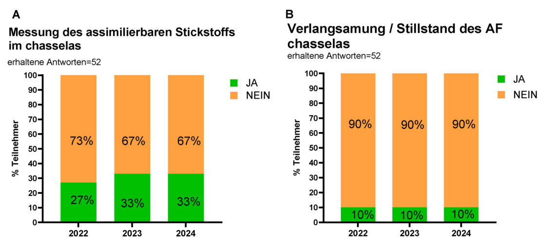 Abbildung 2: (A) Befragte, die in Most von Chasselas Messungen zum assimilierbaren Stickstoff für die Jahrgänge 2022, 2023 und 2024 durchführten. (B) Verlangsamung / Stillstand der alkoholischen Gärung bei Chasselas in Prozent in den Jahrgängen 2022, 2023 und 2024.