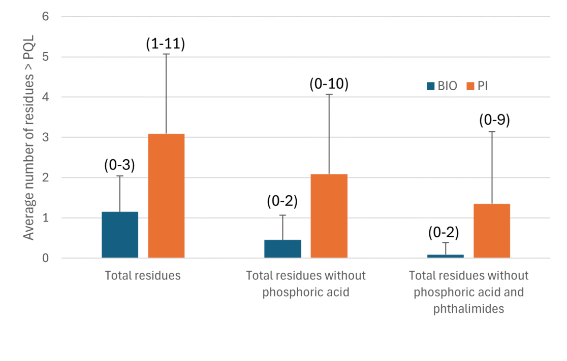The average number of residues ranged between 1.2 for organic wines and 3.1 for IP wines (Fig. 1). The average values decrease considerably when phosphoric acid and phthalimides whose provenance is not necessarily associated with plant-protection product treatments are left out of the equation, resulting in organic wines with virtually no residues and IP wines with a maximum average of 1.4 residues.
