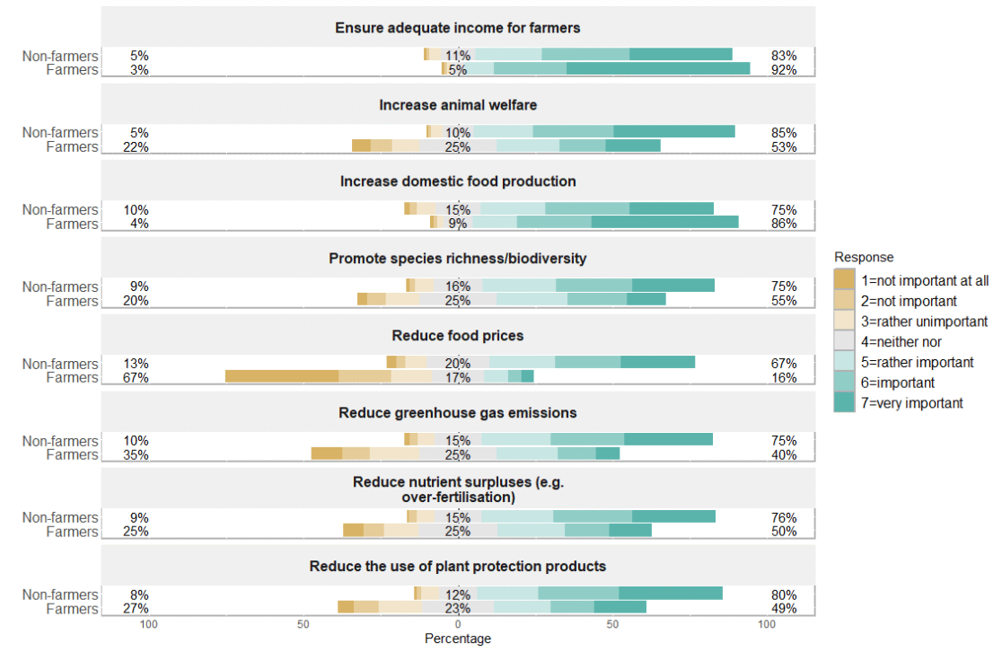 - Farmers attach more importance to adequate agricultural income, non-farmers to lower food prices and to reducing environmental impacts.