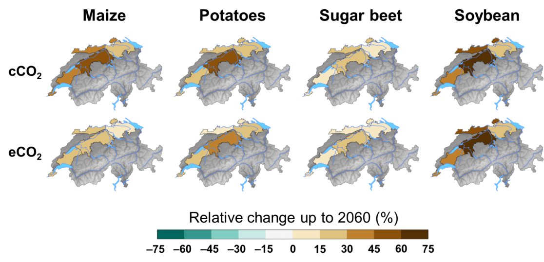 This study simulates harvest yields for a crop rotation with winter wheat, winter barley, maize, oilseed rape, sugar beet and potatoes, soybean, and temporary leys as a catch crop, using a plant-growth model for the present-day climate and the period around 2060. The simulations are based on the climate scenarios provided by the National Centre for Climate Services (NCCS). The growing regions of the Western Plateau, Central Plateau, Eastern Plateau and Eastern Jura were taken into account.