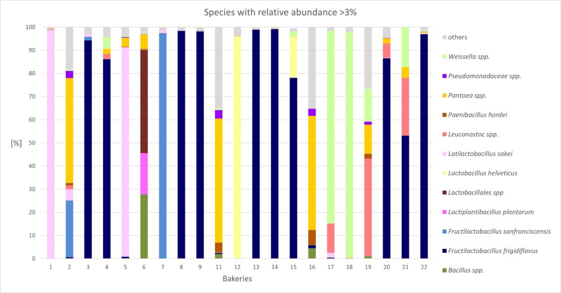 Metagenomic analysis of the dough samples showed low yeast biodiversity and high bacterial biodiversity. The typical sourdough bacterium Fructilactobacillus sanfranciscensis had the highest abundance in one dough only. Fructilactobacillus frigidiflavus, a novel species described in 2025, was dominant in 10 of the 21 doughs. Different species of other lactic acid bacteria dominated in seven doughs. Gram-negative bacteria had the highest relative abundance in three doughs. This indicates that these may have been ‘young’ sourdoughs that had undergone only a few feeds. As for yeasts, only three doughs were found to contain significant quantities of species other than the brewer’s yeast Saccharomyces cerevisiae.