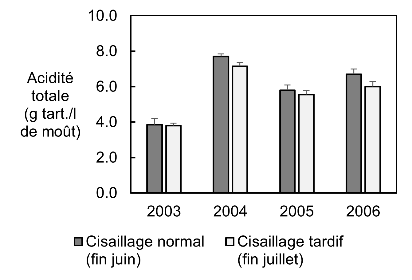 Les résultats montrent que l’impact des conditions climatiques de l’année a été dominant. Le cisaillage tardif a réduit la croissance des entre-cœurs certaines années (Figure 1A) et a légèrement diminué la teneur en phosphore (−0,03 % m.s.) et en magnésium (−0,03 % m.s.) dans les feuilles. Il n’a pas eu d’impact significatif sur le rendement ni sur la pourriture grise (Figure 1B). Il a diminué l’acidité totale (–0,4 g/l éq. tartrique, Figure 2) et augmenté le pH (+0,02) dans le moût, sans influencer l’accumulation des sucres solubles. Retarder le cisaillage peut être bénéfique certaines années pour limiter la croissance des entre-cœurs et réduire l’entassement du feuillage lorsque la vigueur de la vigne est excessive. Cependant, l’intérêt physiologique et économique du cisaillage tardif reste faible et l’impact sur la composition du moût est limité.