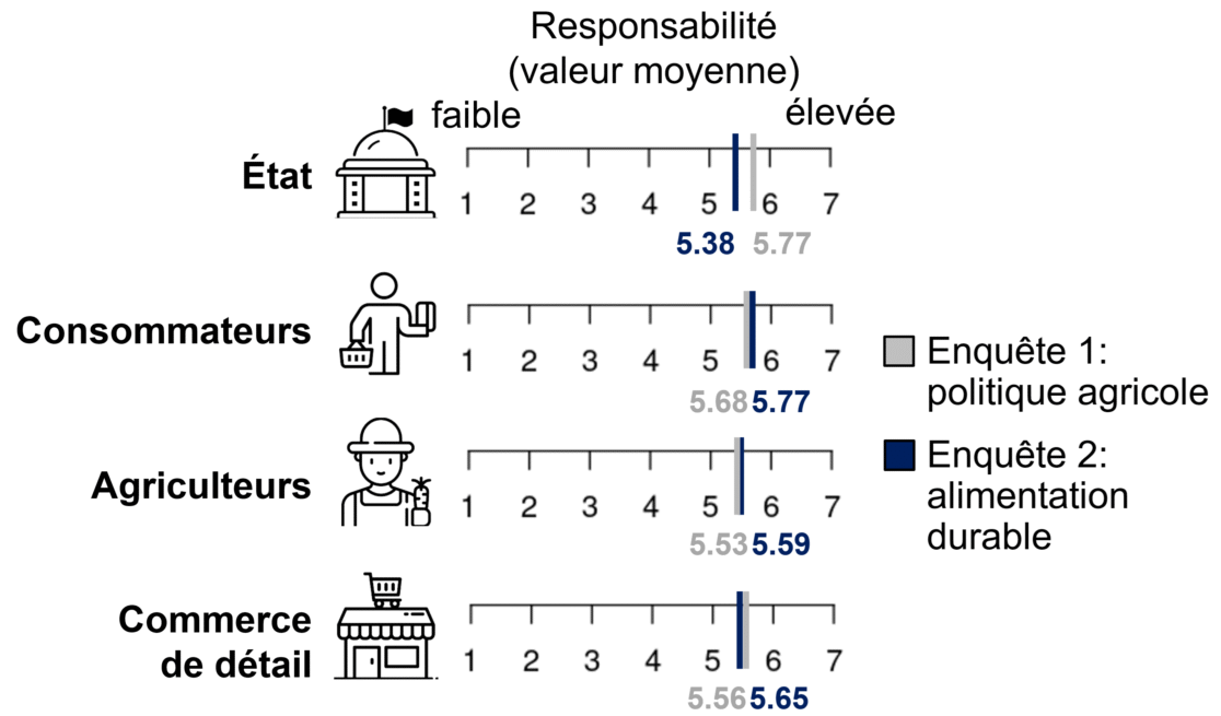 - La plupart des personnes interrogées considèrent que l’État, les agricultrices et agriculteurs, le commerce de détail ainsi que les consommatrices et consommateurs ont une responsabilité partagée importante en matière de production et de consommation.